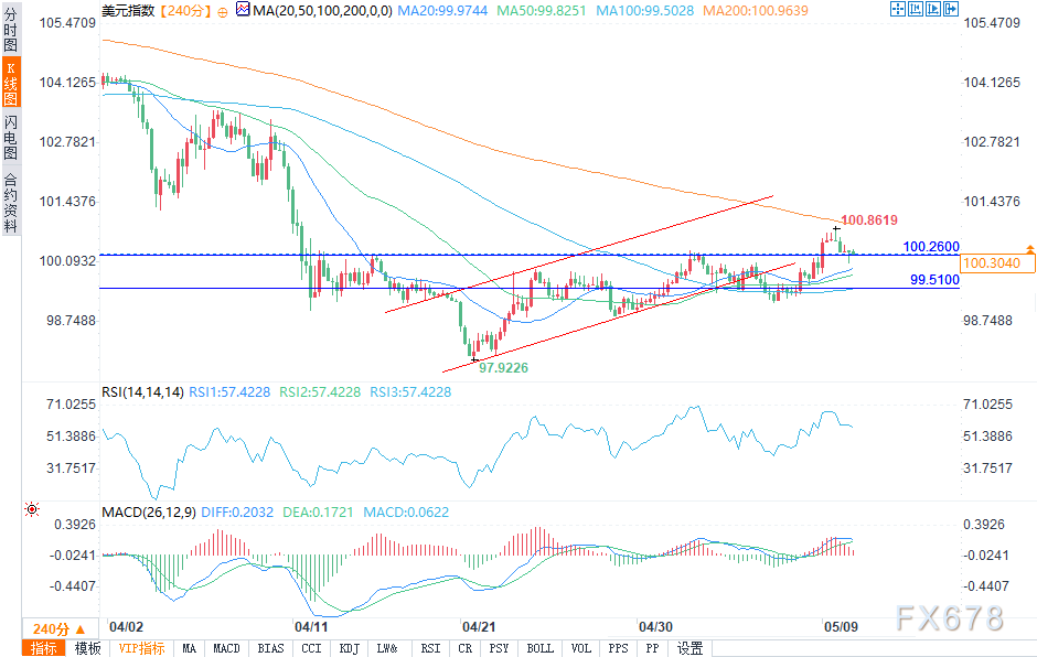 嘉盛——周五(5月9日)美盘时段,美元指数走跌,盘中报100.2794/2967,跌幅0.34%。