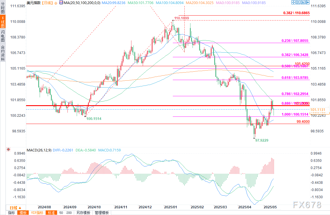 嘉盛——周三(5月14日)欧盘时段,美元指数(DXY)盘中跌至100.58,下跌0.40%。此前,投资者因低于预期的通胀数据和缓和的贸易紧张局势,重新调整了对美联储政策的预期。