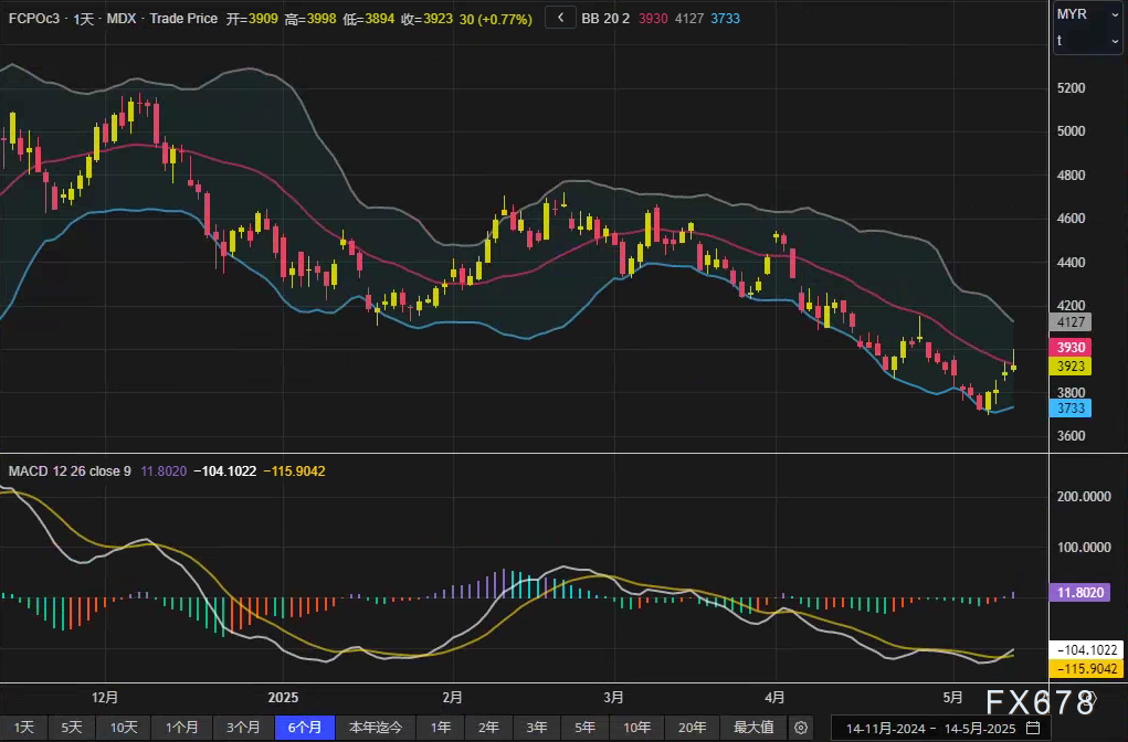 嘉盛——周三(5月14日),马来西亚衍生品交易所(BMD)棕榈油主力合约FCPOc3连续第四个交易日收涨,7月合约收盘报3925林吉特/吨,日内涨幅0.82%。技术面显示,价格站稳布林通道中轨3930林吉特上方,但MACD柱状线仍位于零轴以下,反映市场反弹动能尚未形成趋势性反转。日内行情主要受大连植物油走强带动,但林吉特兑美元汇率升值0.81%抑制了涨幅。