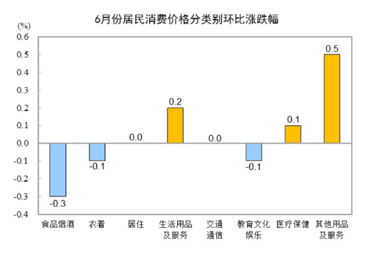 6月份,全国居民消费价格环比下降0.1%。其中,城市下降0.1%,农村持平;食品价格下降0.4%,非食品价格持平;消费品价格下降0.1%,服务价格持平。
