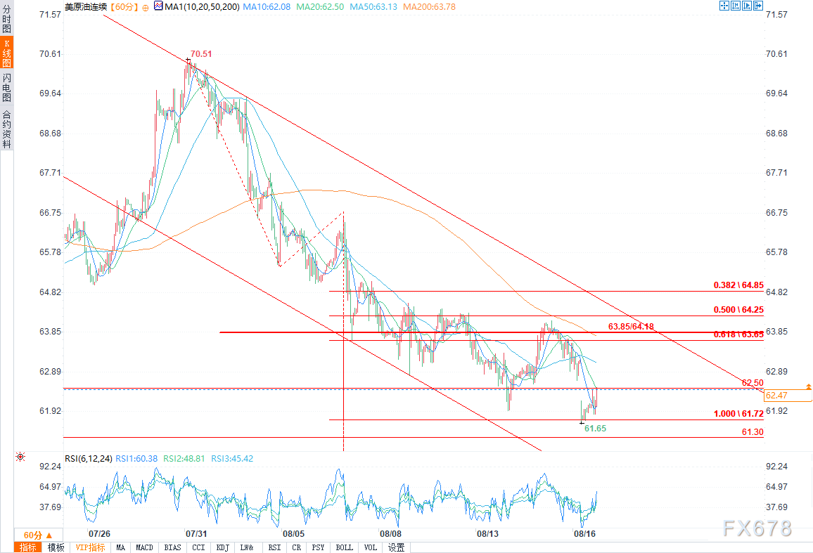 上周五特朗普与普京在阿拉斯加举行会晤后,WTI原油最低下跌至61.65美元,目前价格已从低点反弹至62.45美元附近。