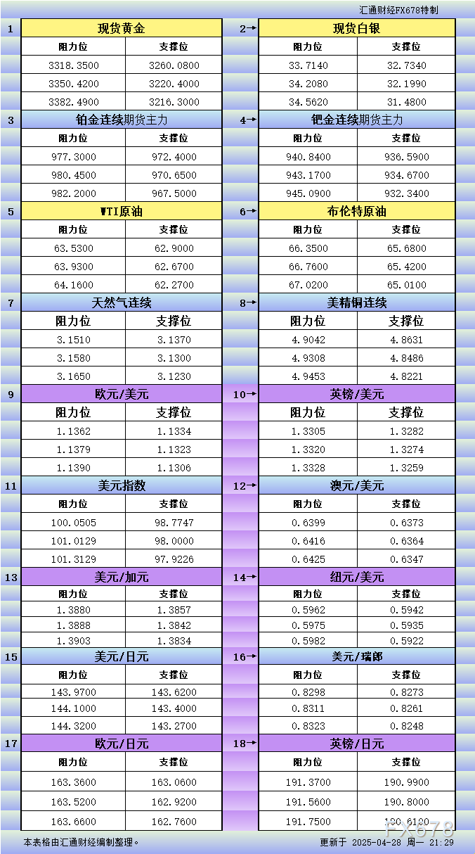 嘉盛中文官网:4月29日亚市更新支撑阻力:18品种支撑阻力(金银铂钯原油天然气铜
