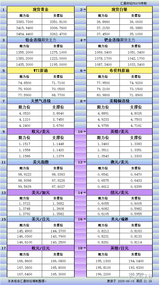 嘉盛外汇官网:6月19日美市更新支撑阻力:18品种支撑阻力(金银铂钯原油天然气铜